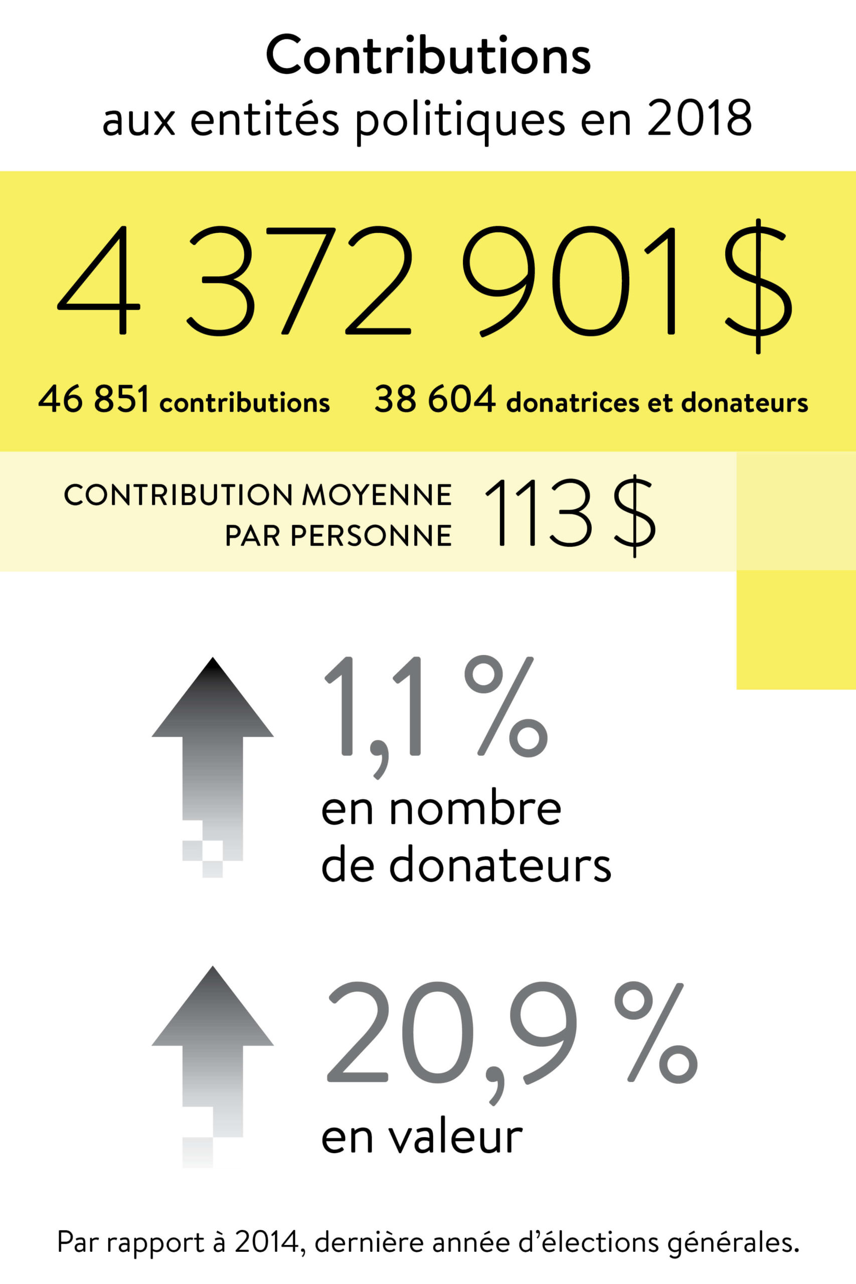 Le nombre de donatrices et de donateurs est 1,1 % plus élevé qu’en 2014, l’année d’élections générales précédente. La valeur des contributions a augmenté de 20,9 % par rapport à 2014.
