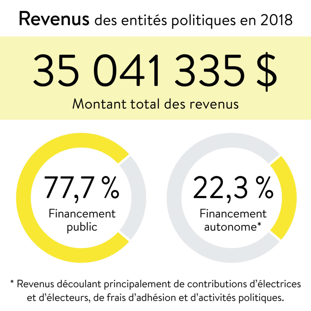 - Pour l’année 2018, qui était une année d’élections générales, le total des revenus des entités politiques provinciales est de 35 041 335 $.