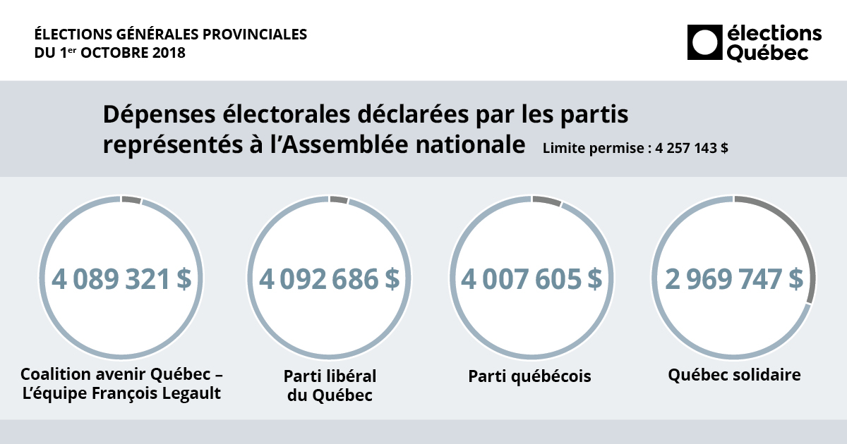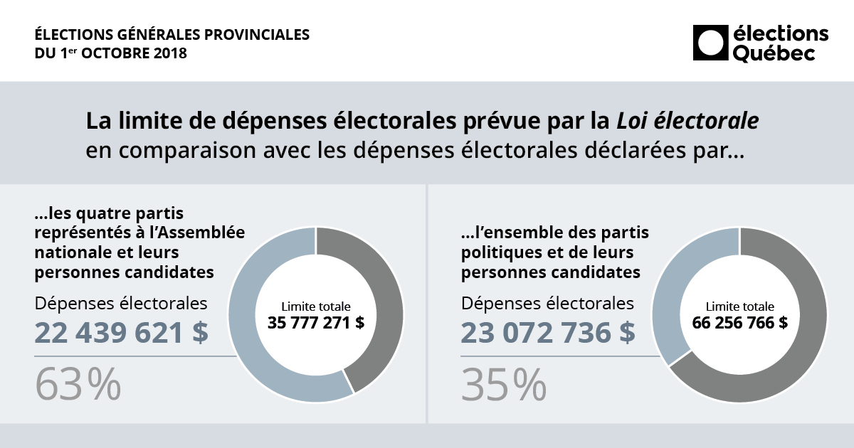À titre comparatif, en 2014, l’ensemble des partis et des personnes candidates avaient dépensé une somme correspondant à 33,7 % de la limite permise, alors que ce ratio était de 53,4 % pour les quatre partis représentés à l’Assemblée nationale et leurs personnes candidates.