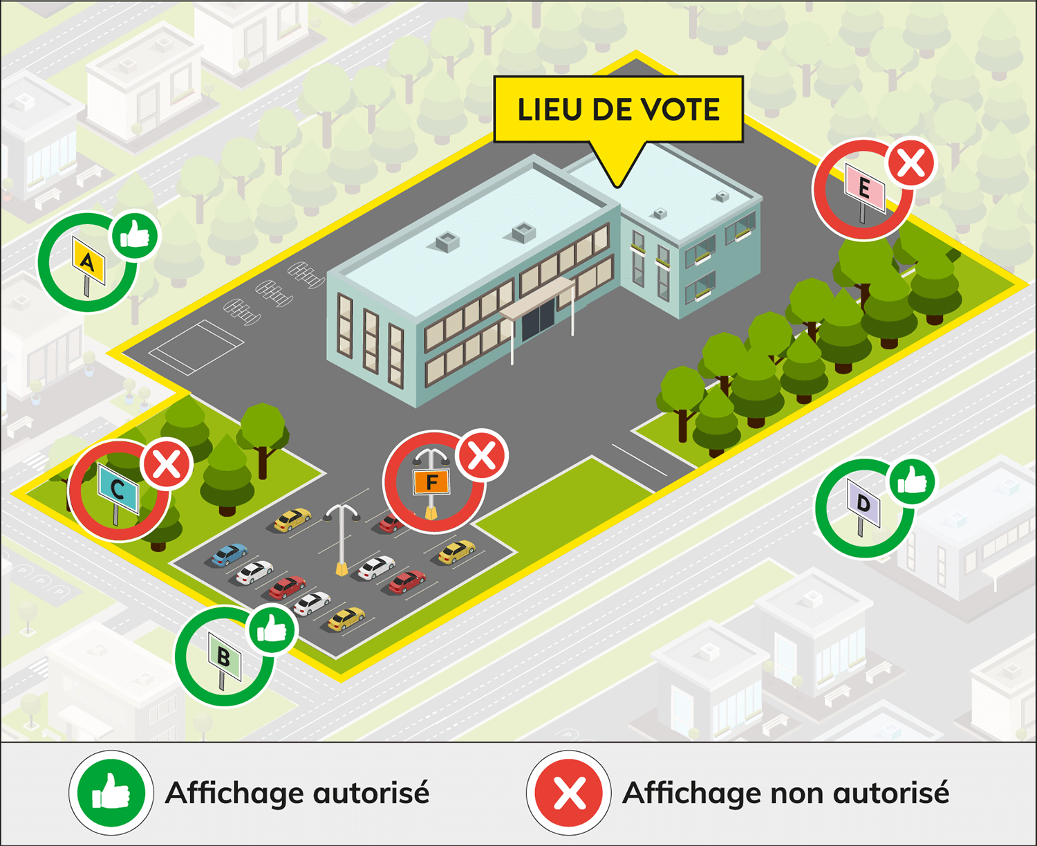 Le visuel suivant illustre les endroits où l’affichage est autorisé ou non lorsque le bureau de vote est situé dans une école.