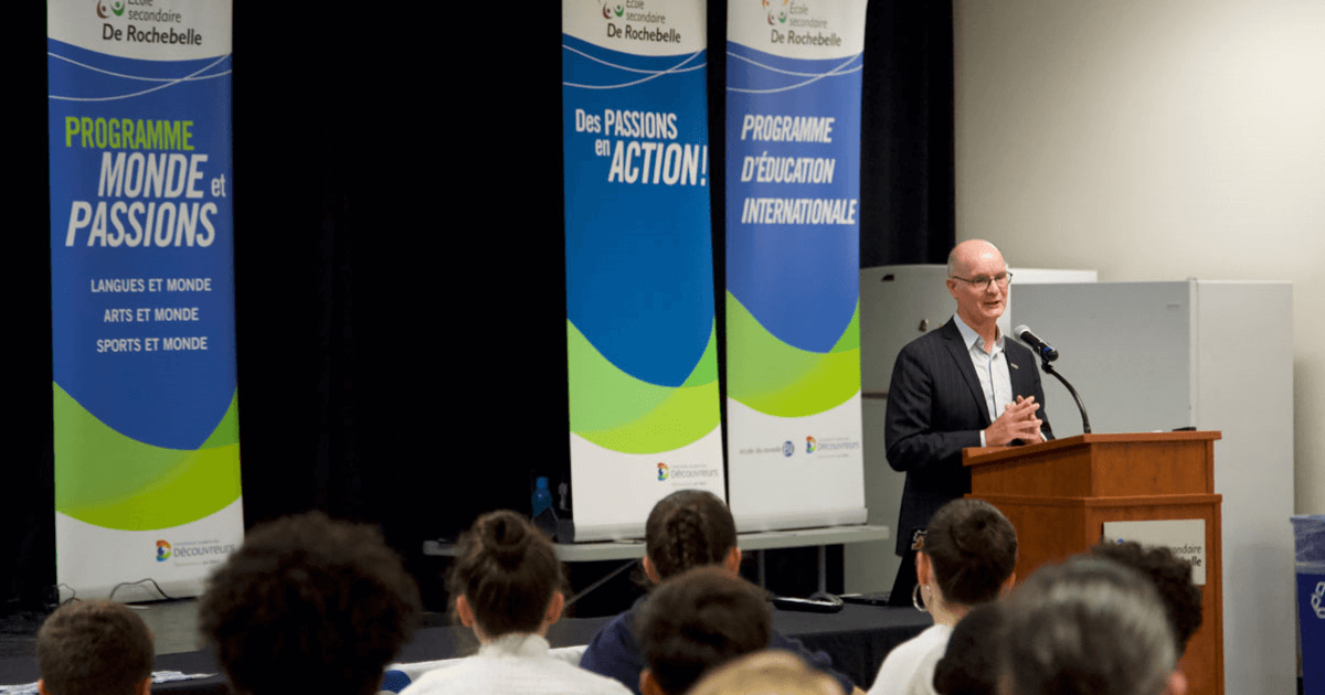 Le directeur général des élections, M. Jean-François Blanchet, était présent lors de l’assermentation des membres du conseil d’élèves de l’école secondaire De Rochebelle, située à Québec, le jeudi 5 octobre dernier. C’est avec grand plaisir qu’il s’est adressé aux jeunes élus pour les féliciter et pour souligner l’importance du rôle qu’ils joueront au sein de leur démocratie scolaire.