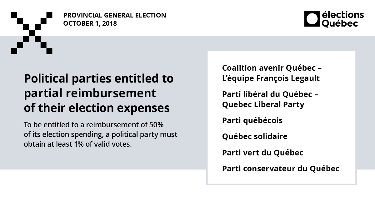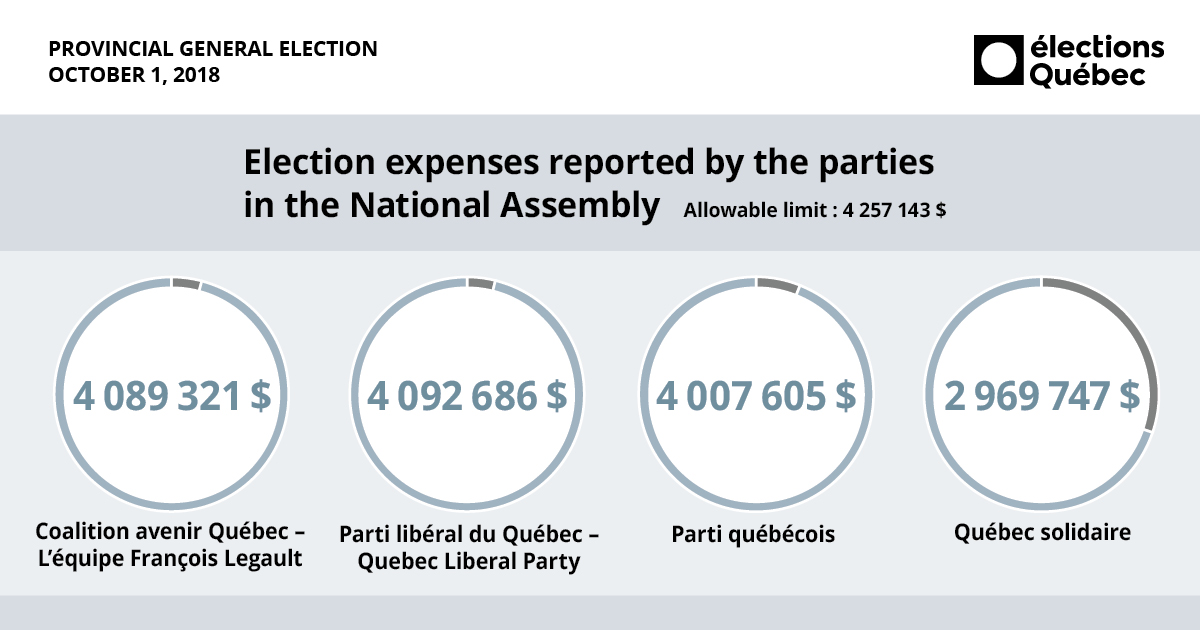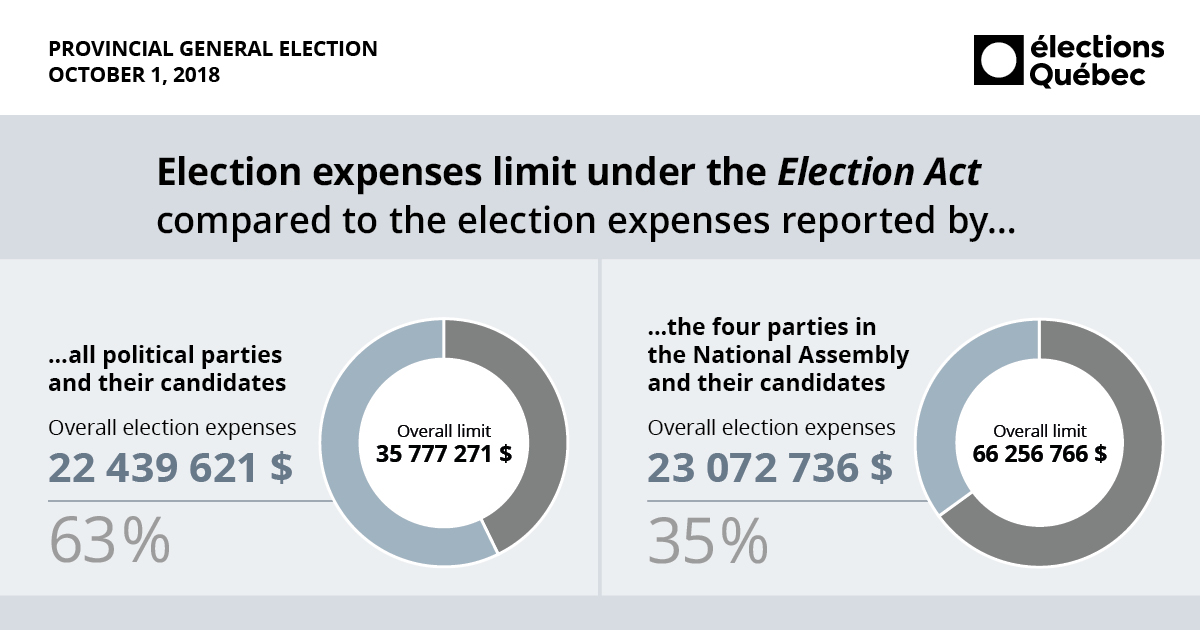 As a comparison, in 2014, election expenses of all parties and candidates represented 33.7% of the allowable limit, while the percentage was 53.4% for the four parties in the National Assembly and their candidates.